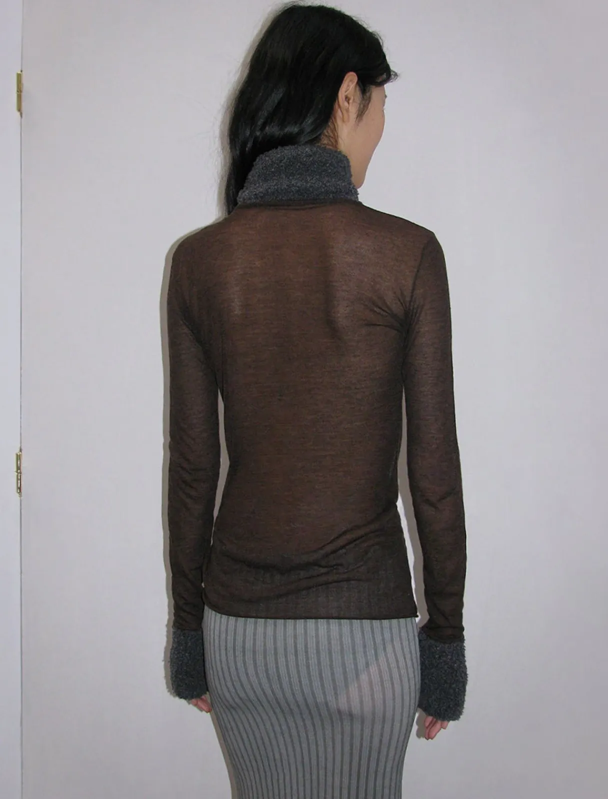 Delikat, Gennemsigtig, Højhalset Striktrøje Med Strikket Shearling-Effekt Rundt Om Halsen Og Manchetterne.