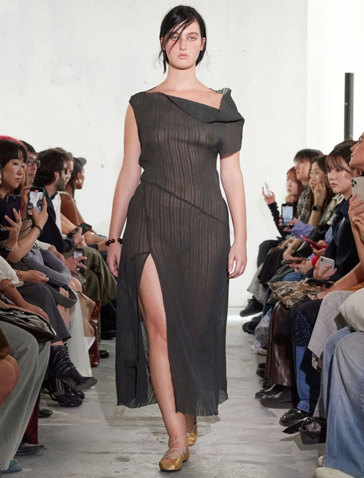 Sart, Gennemsigtig, Asymmetrisk Lang Kjole Med Foldet Halsudskæring Og Rå Kanter.