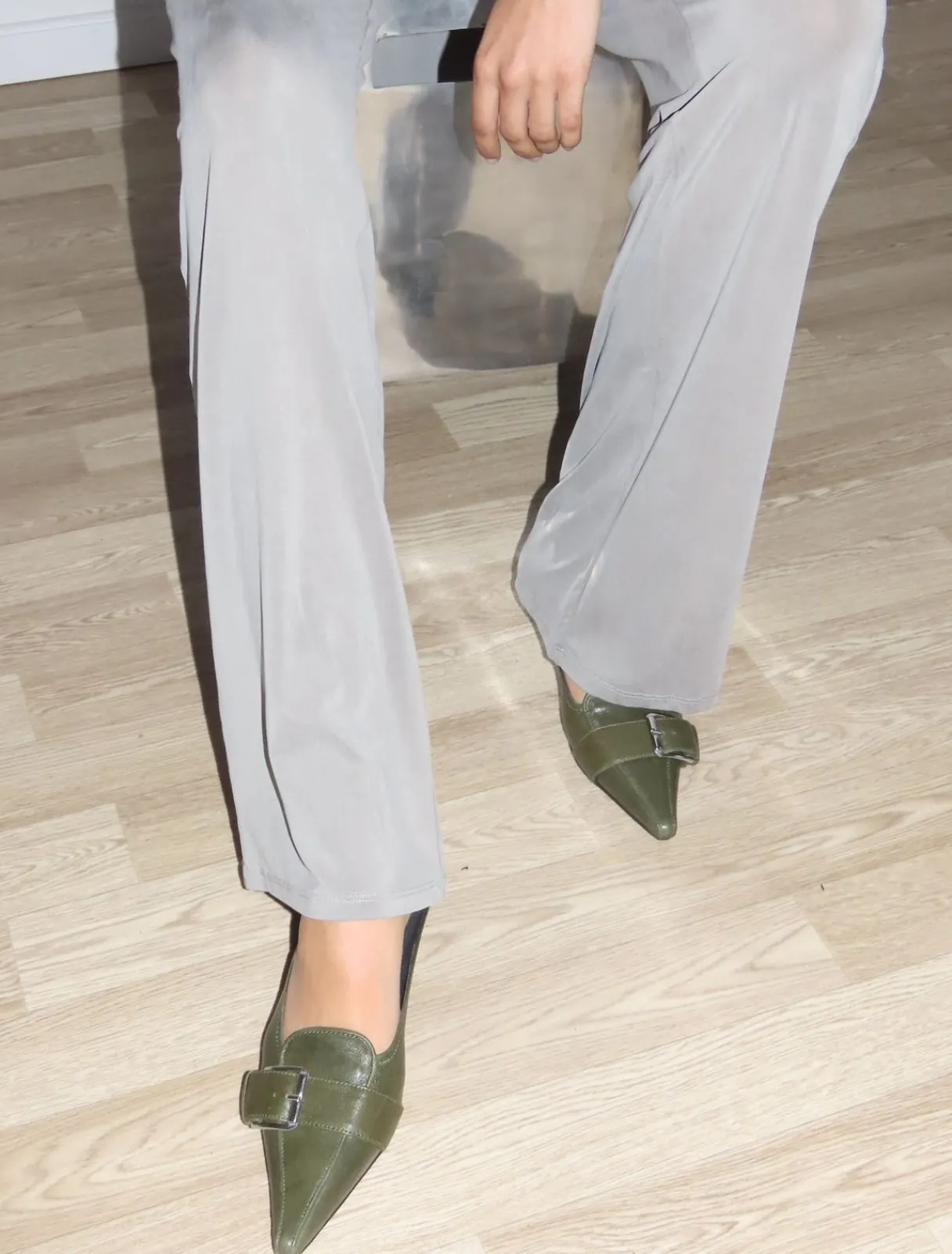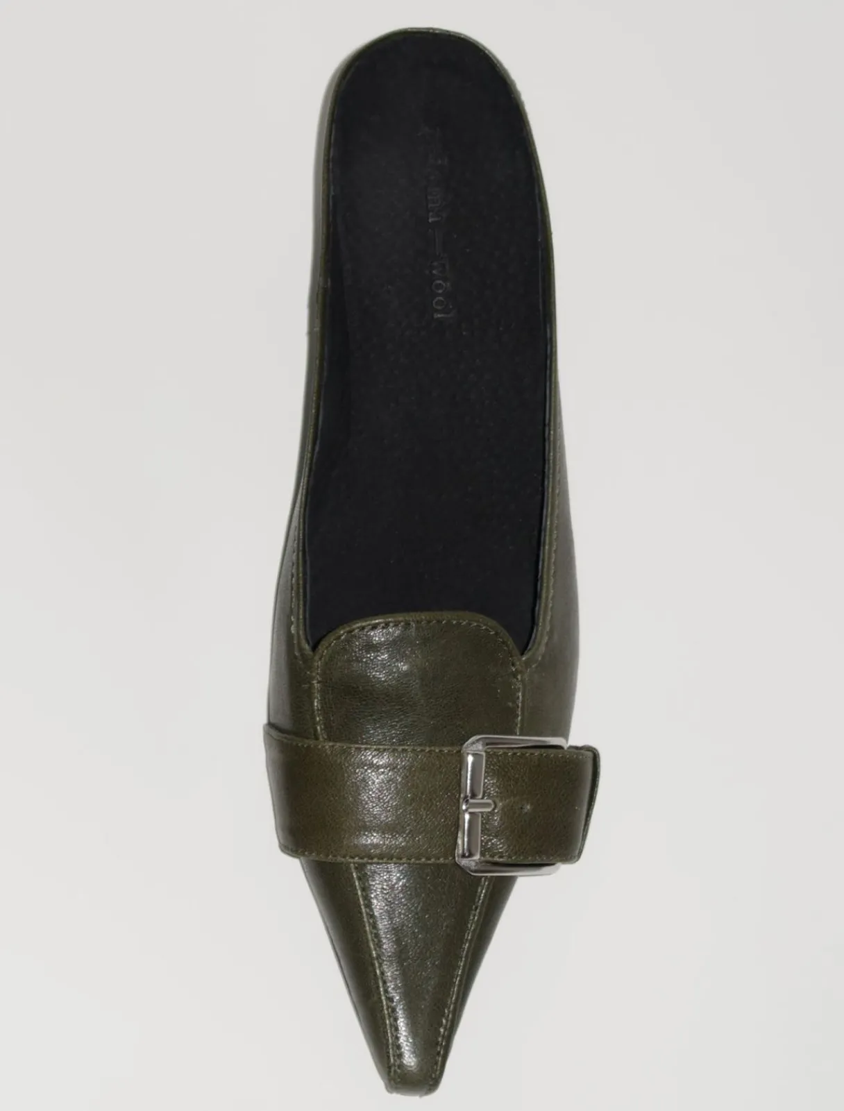 Rygløs Pumpe Med Spids Tå Med 4 Cm Hæl. Den Har En Læderrem Med Et Dekorativt Spænde.