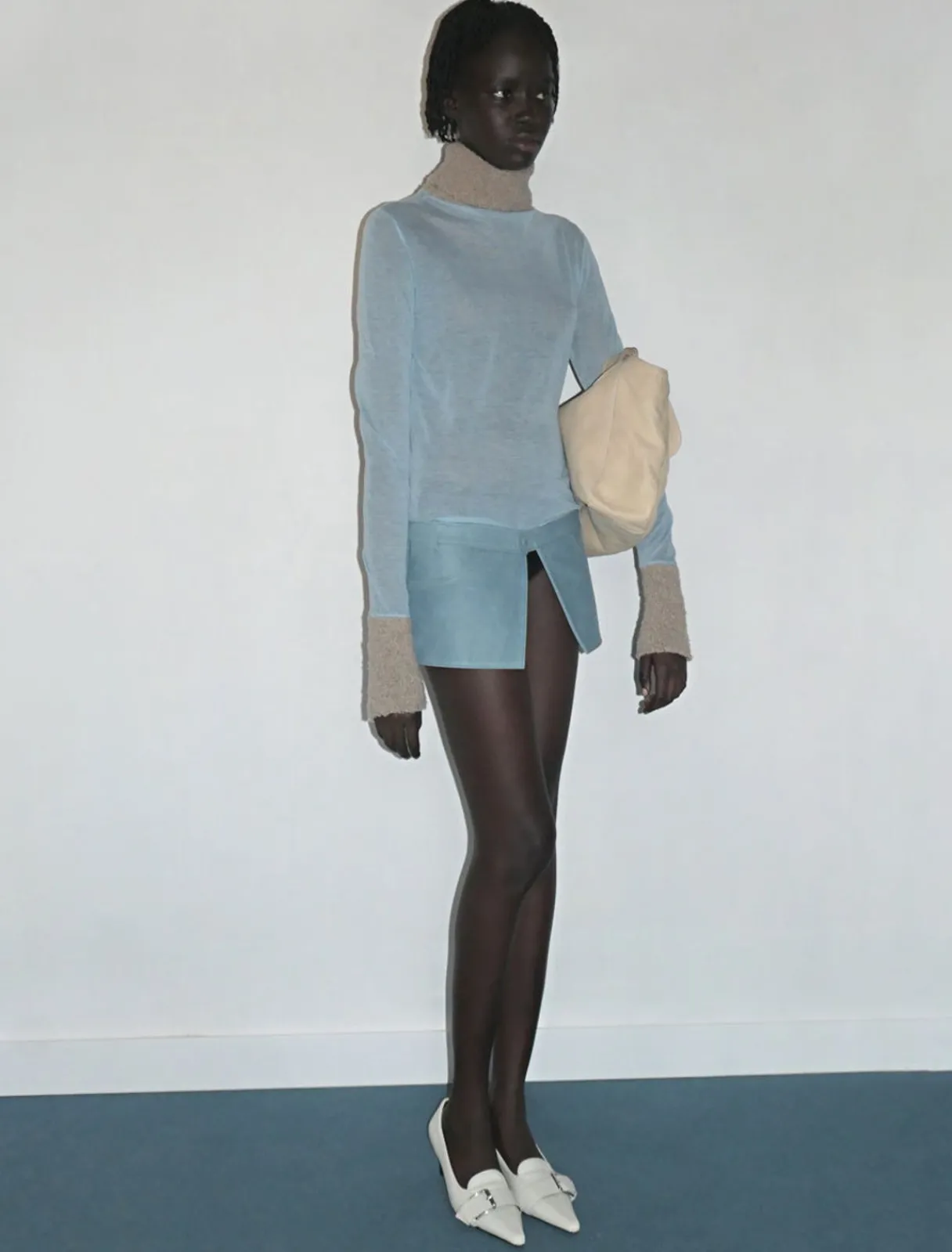 Delikat, Gennemsigtig, Højhalset Striktrøje Med Strikket Shearling-Effekt Rundt Om Halsen Og Manchetterne.