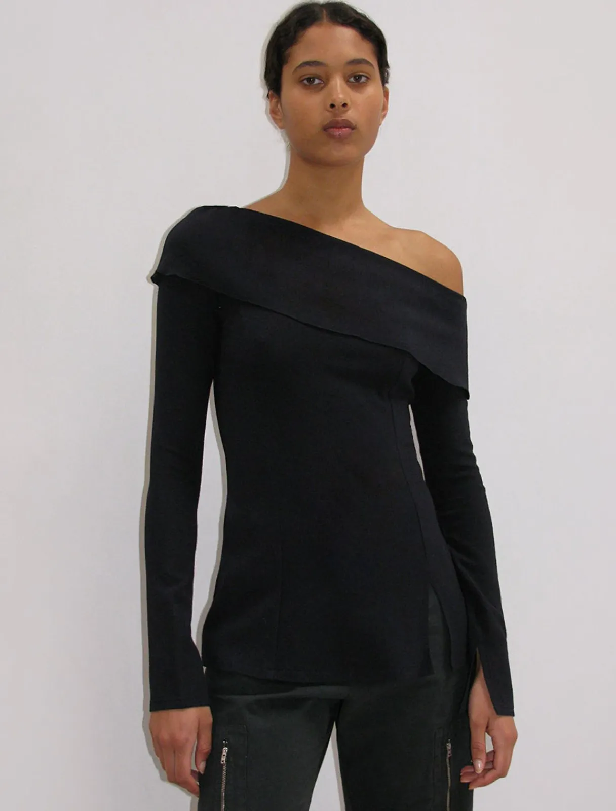 Langærmet, Elastisk Uldtop Med En Foldet Asymmetrisk Halsudskæring Og Detaljerede Slidser På Kropskant Og Manchetter.