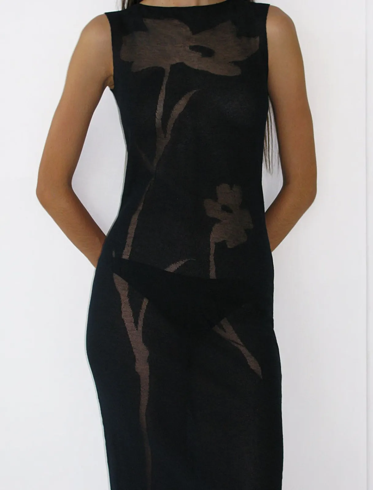 Ærmeløs Strikkjole Med Blomsterjacquard. Blomsterområdet Er Gennemsigtigt, Og Bunden Er Uigennemsigtig.