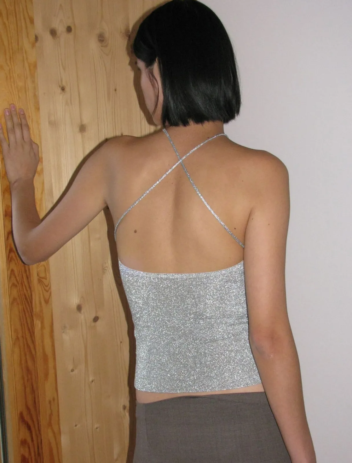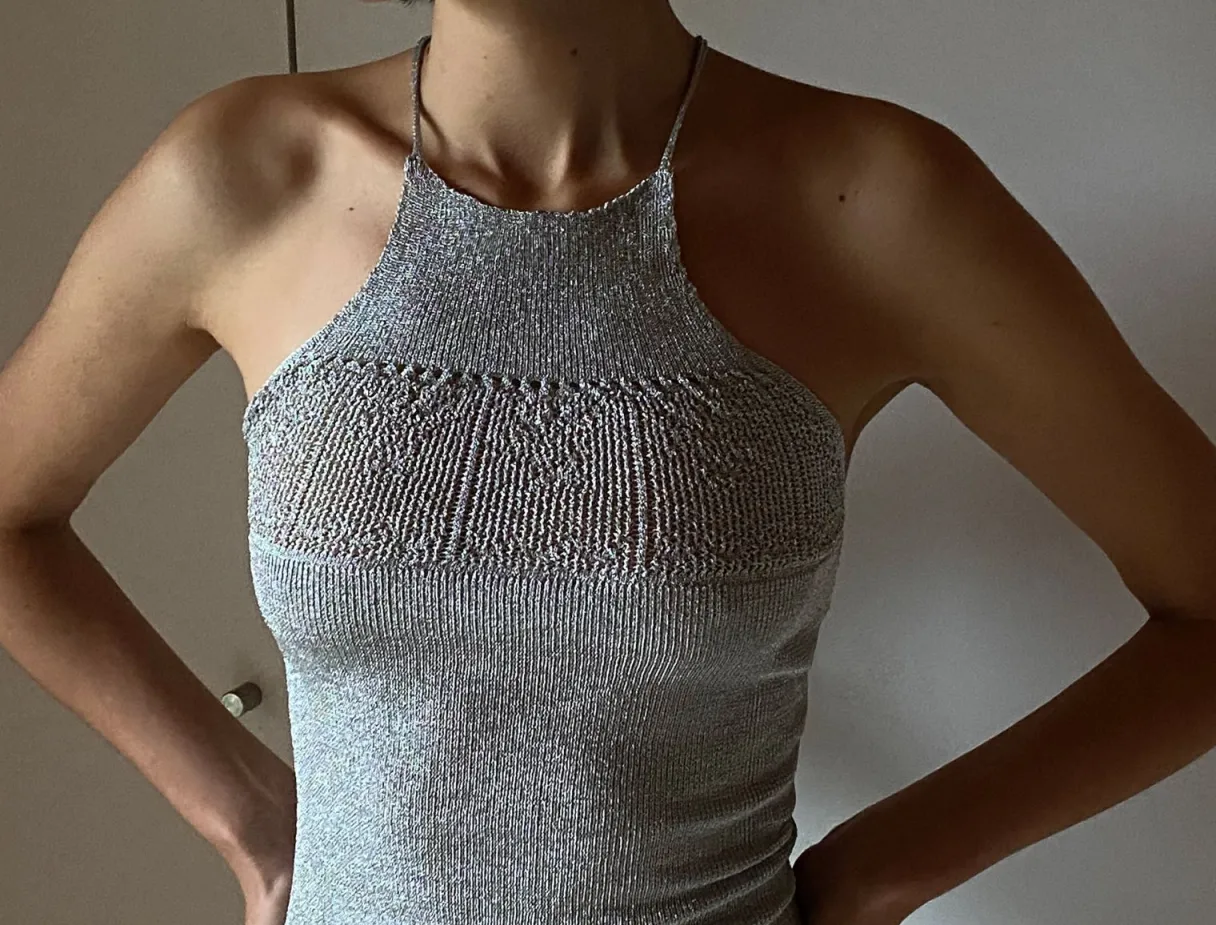 Metalisk Top Med Strikdetalje På Brystet Og Krydsede Stropper På Ryggen.