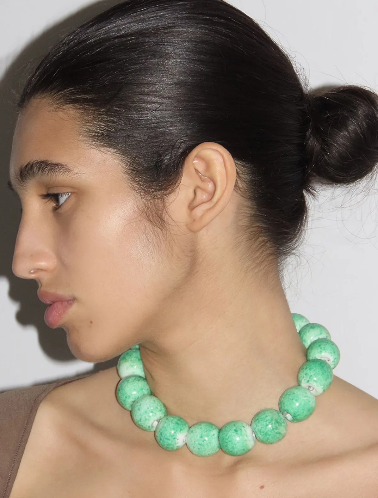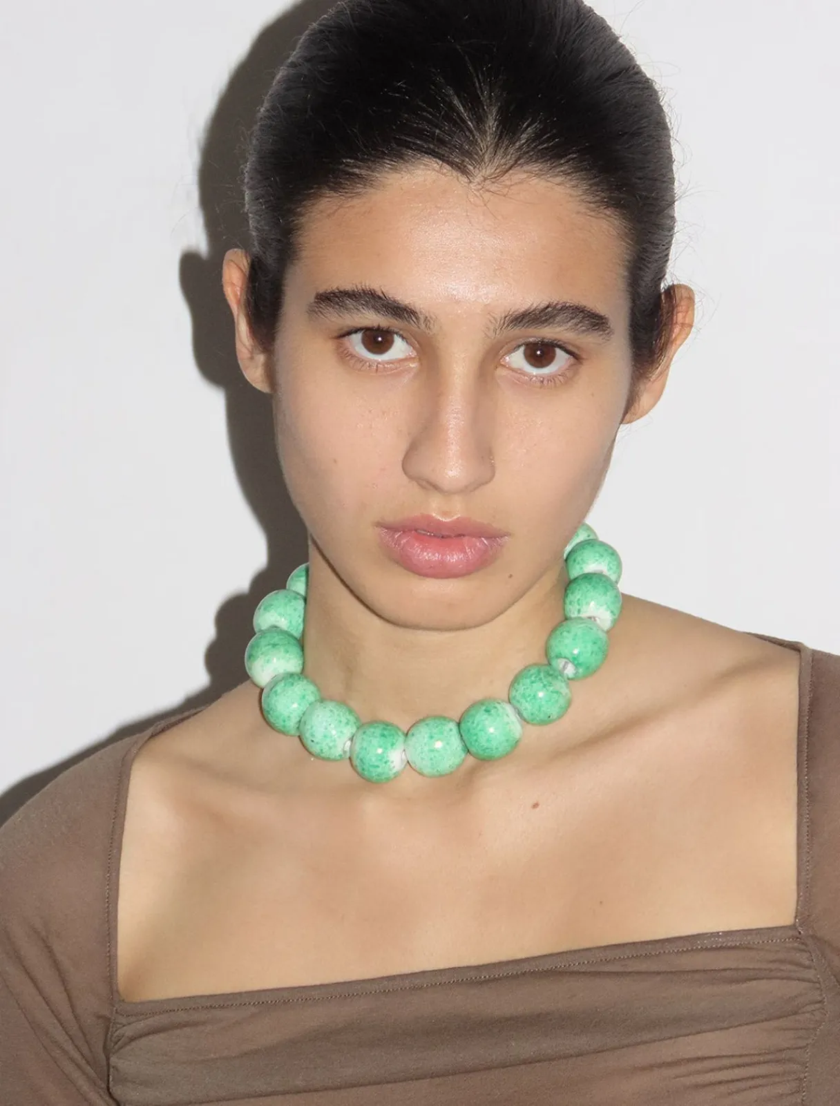 Halskæde Af Store Keramiske Perler. Forgyldt Sølvkæde Og Lås.