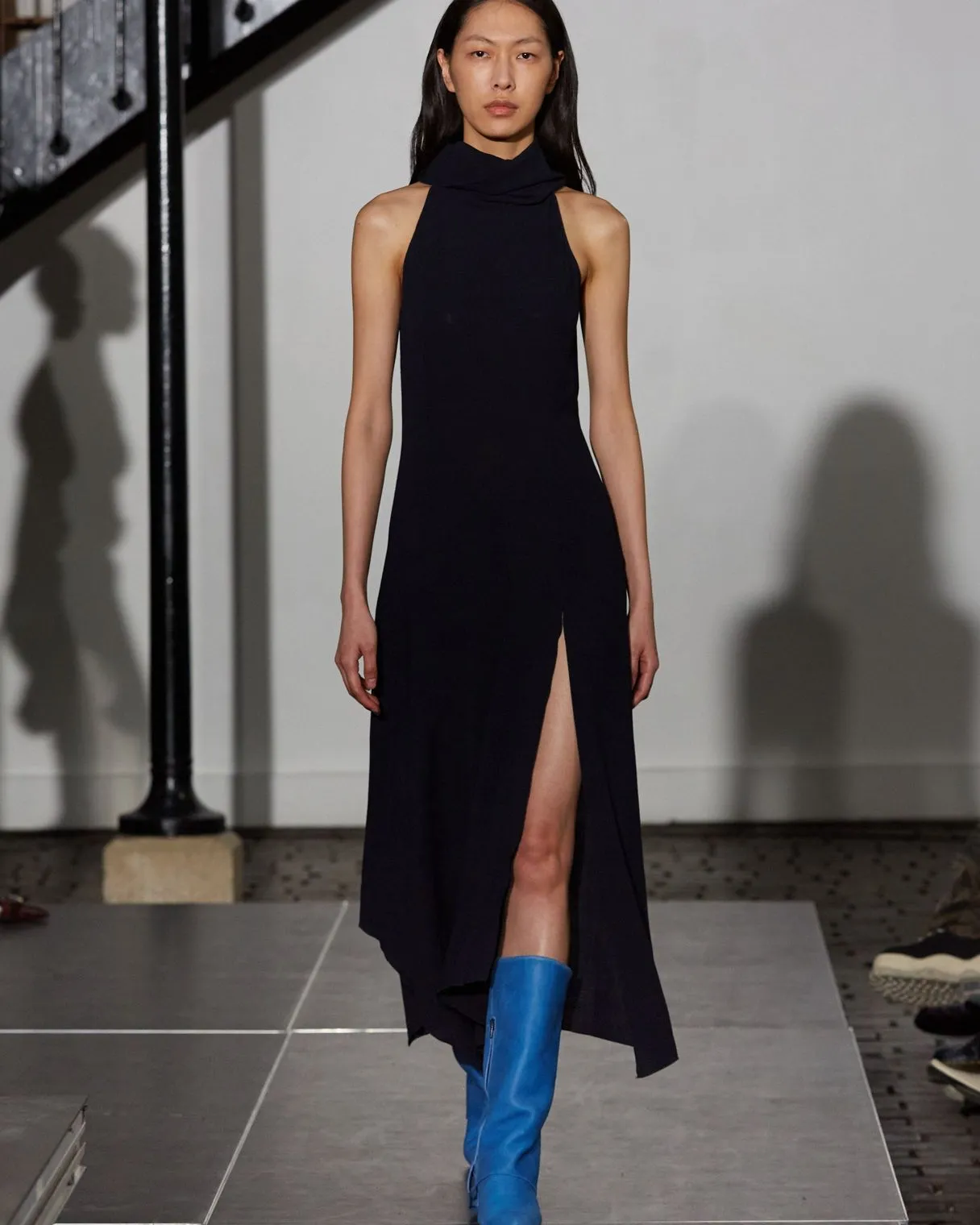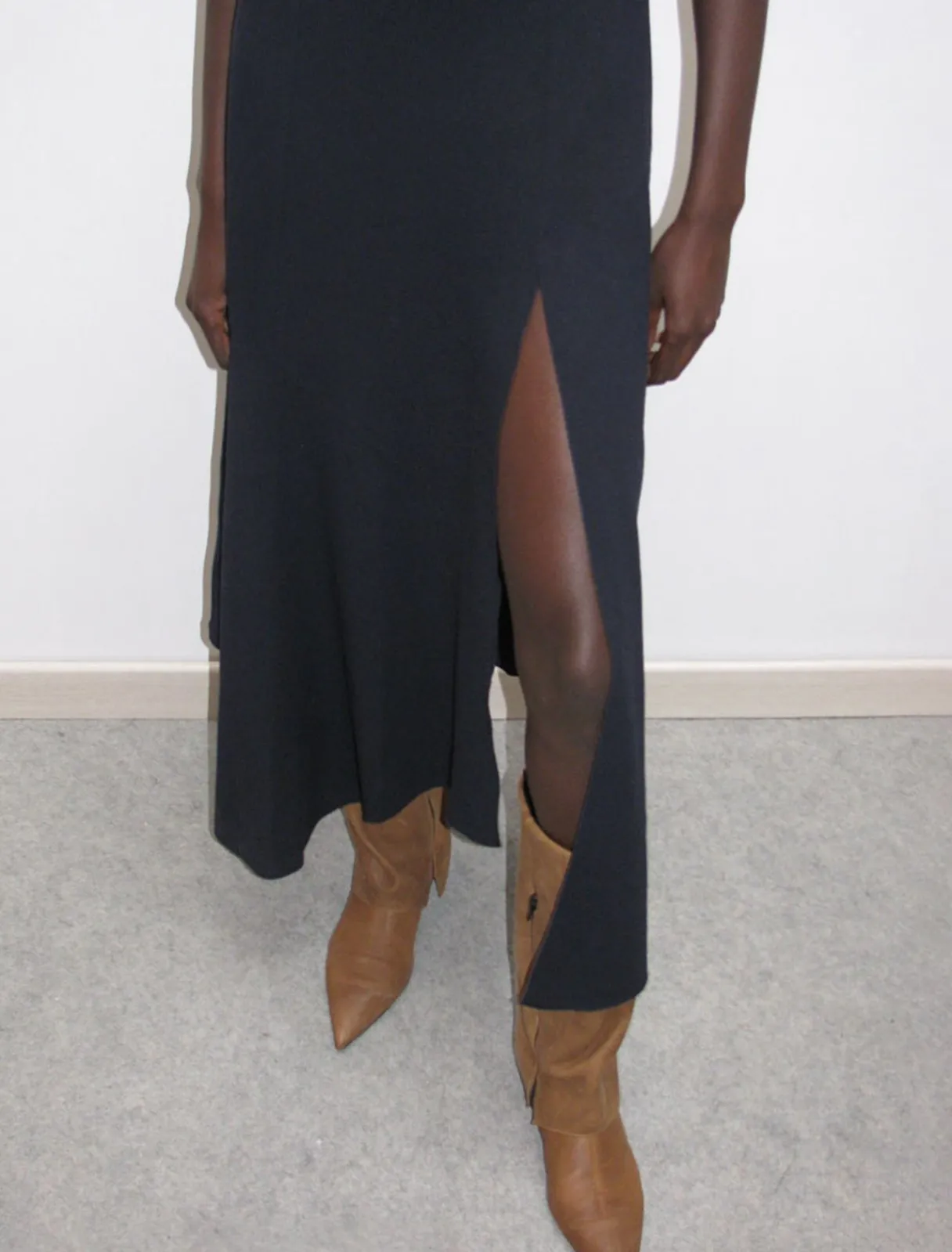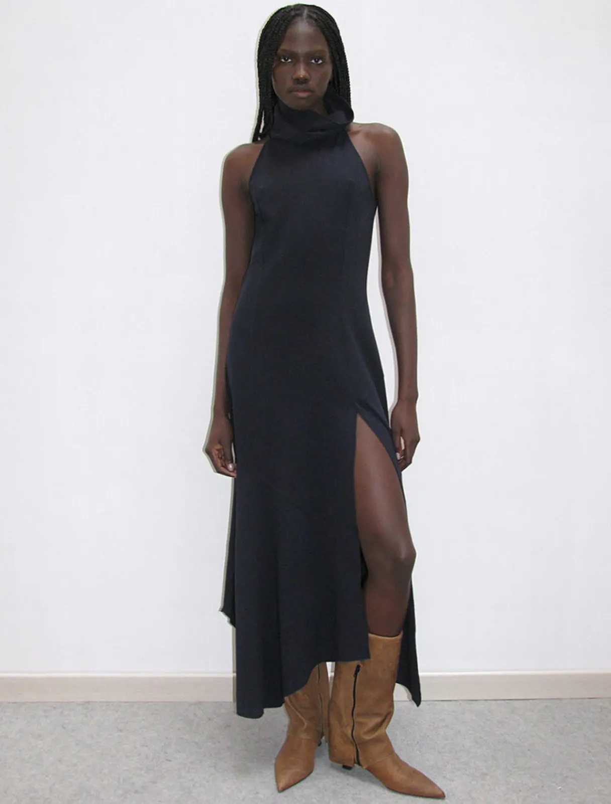 Ærmeløs Draperet Kjole Med Høj Hals Med En Åbning På Forsiden Og Asymmetrisk Bund.
