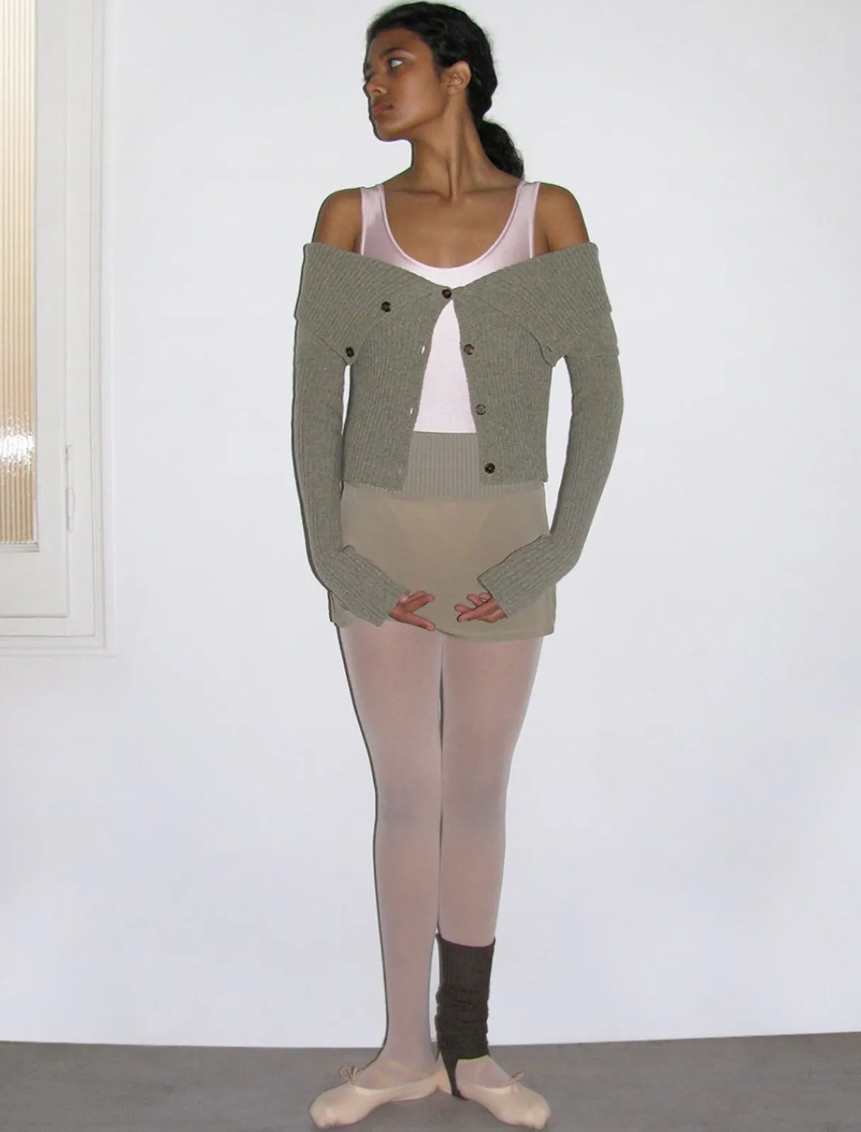 Strikket Bardot Top Med Frontal Knaplukning. Leveres Med Armvarmere I Samme Stof.