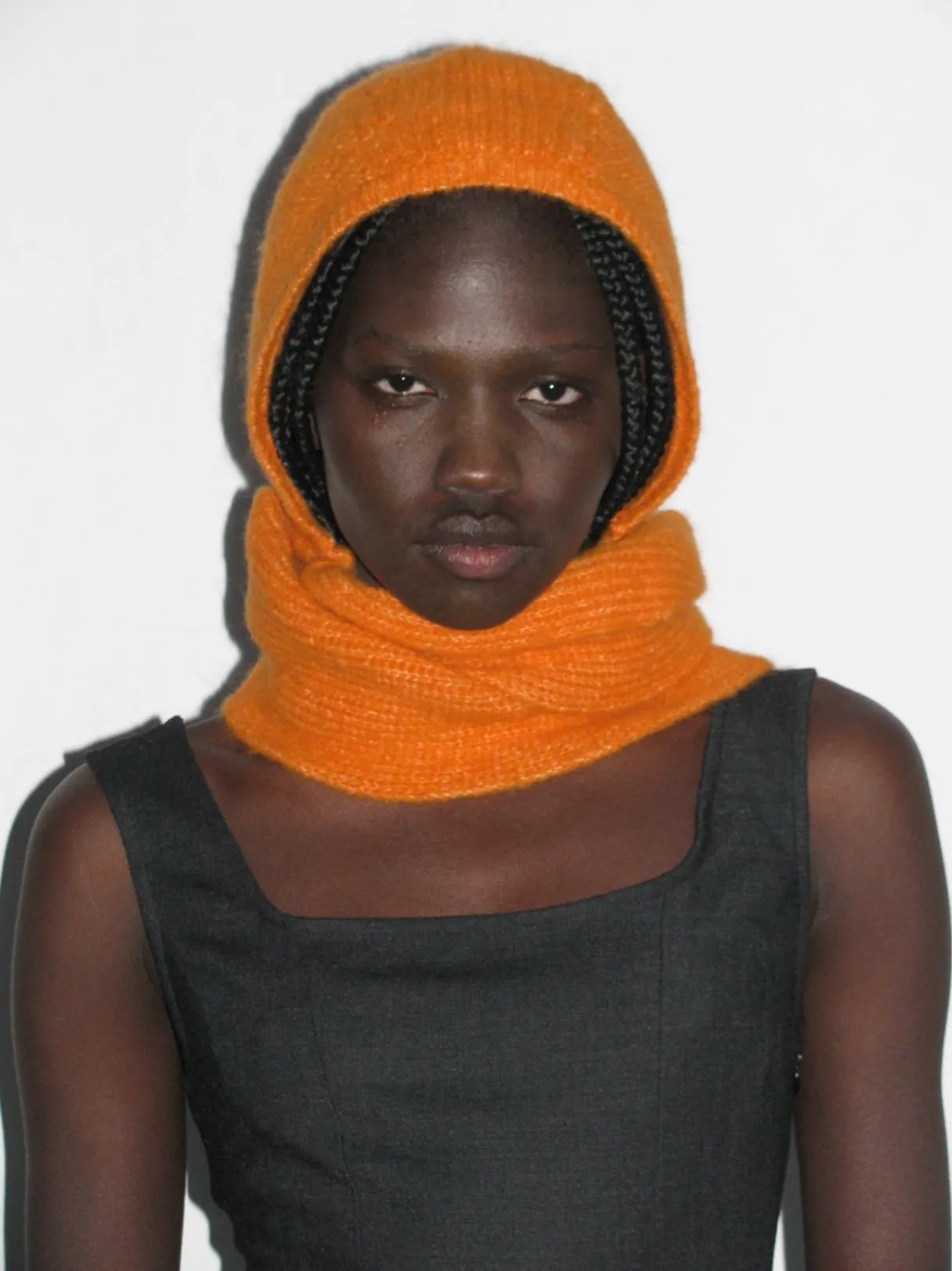 Varm Strikket Hætte Med Et Bredt Slips Til At Bære Rundt Om Halsen Som Et Tørklæde.