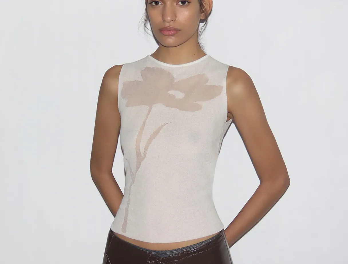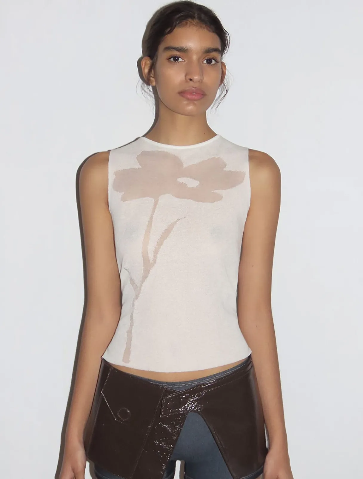 Strik Ærmeløs Top Med Rund Halsudskæring Med Blomsterjacquard. Blomsterområdet Er Gennemsigtigt, Mens Bunden Er Uigennemsigtig.