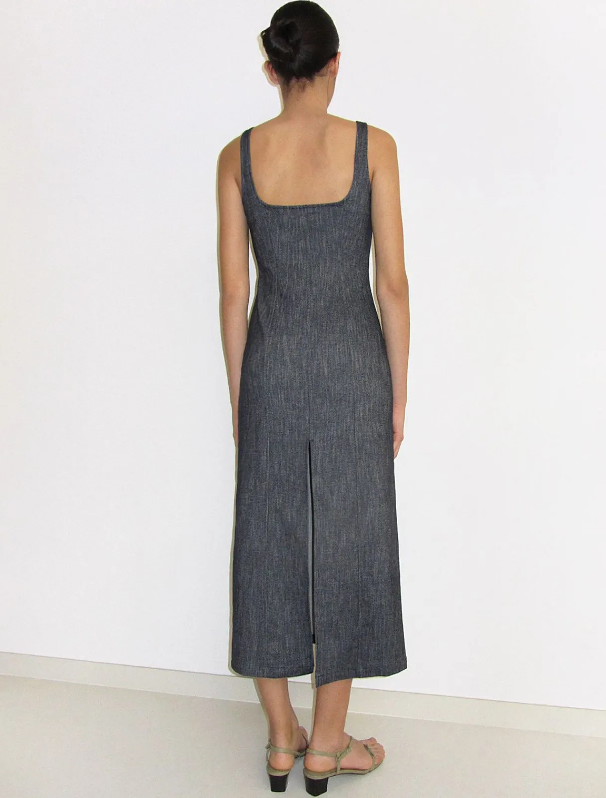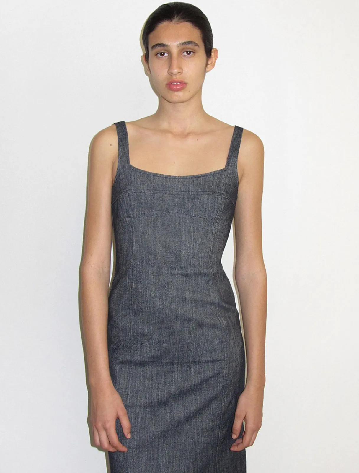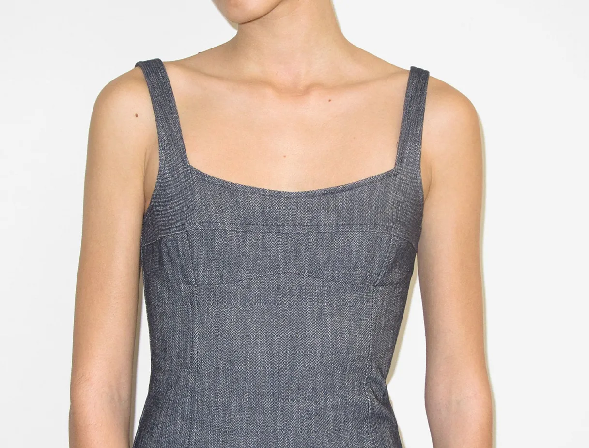 Elastisk, Denimeffekt, Stroppekjole Med Brystsøm. Usynlig Sidelynlås.