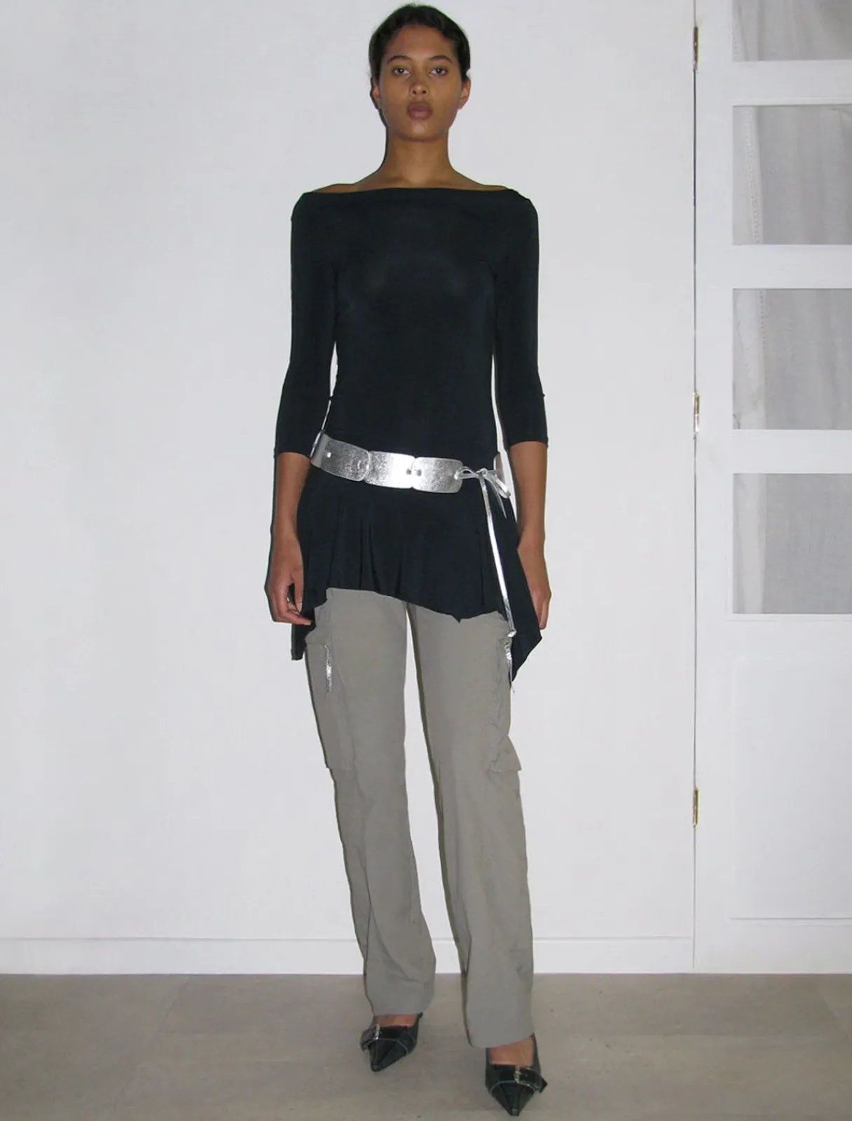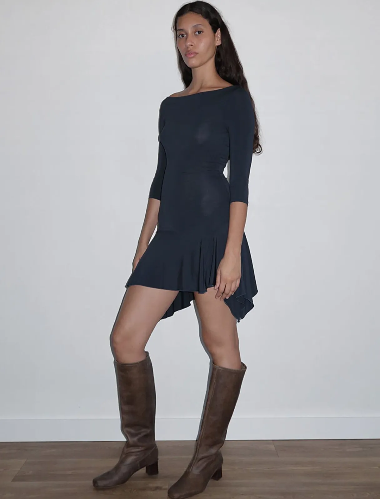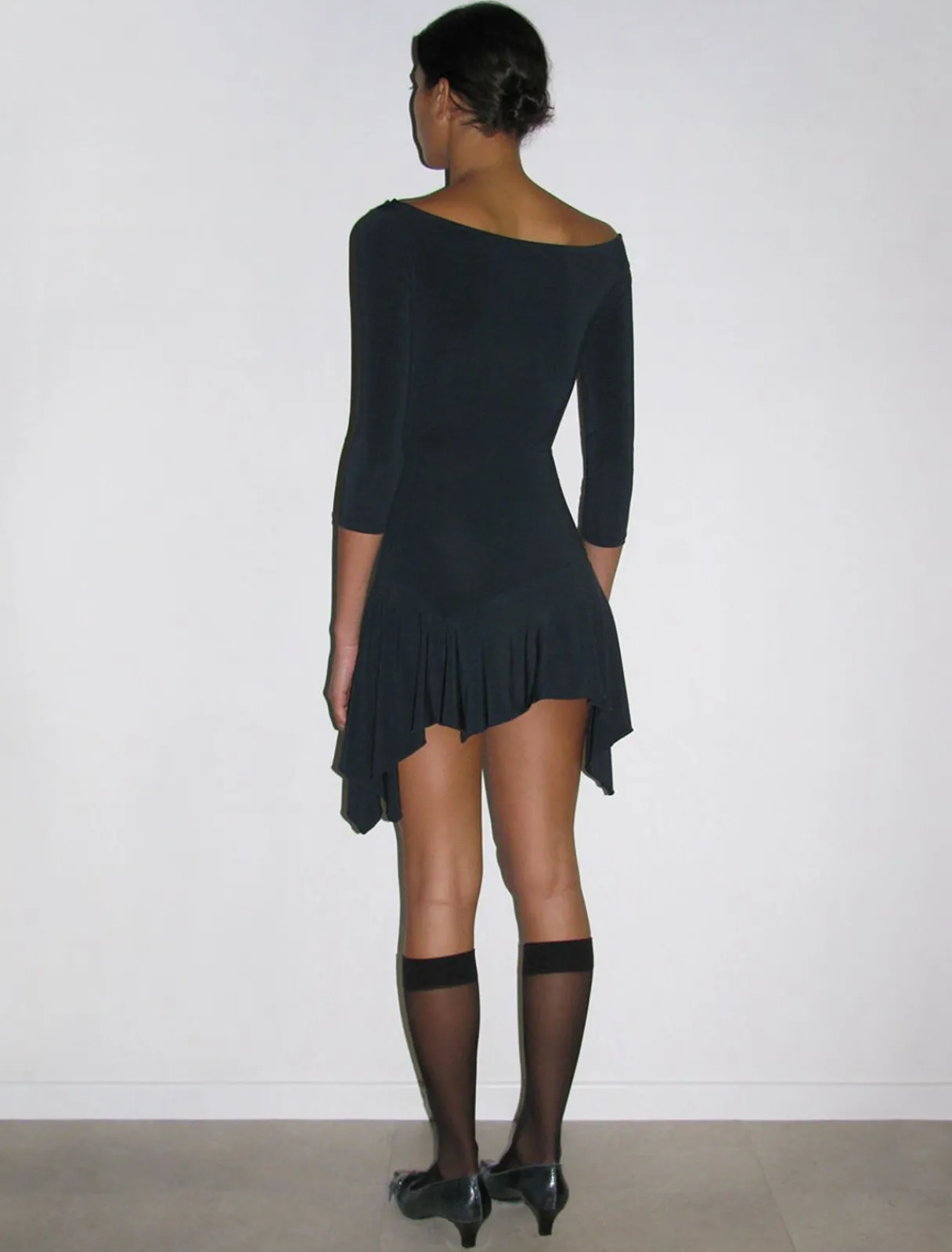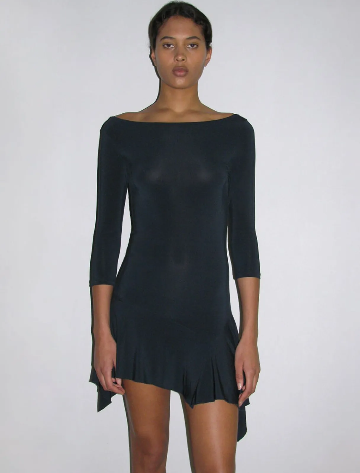 Blød Minikjole Med 3/4 Ærmer Og Asymmetrisk Halsudskæring.