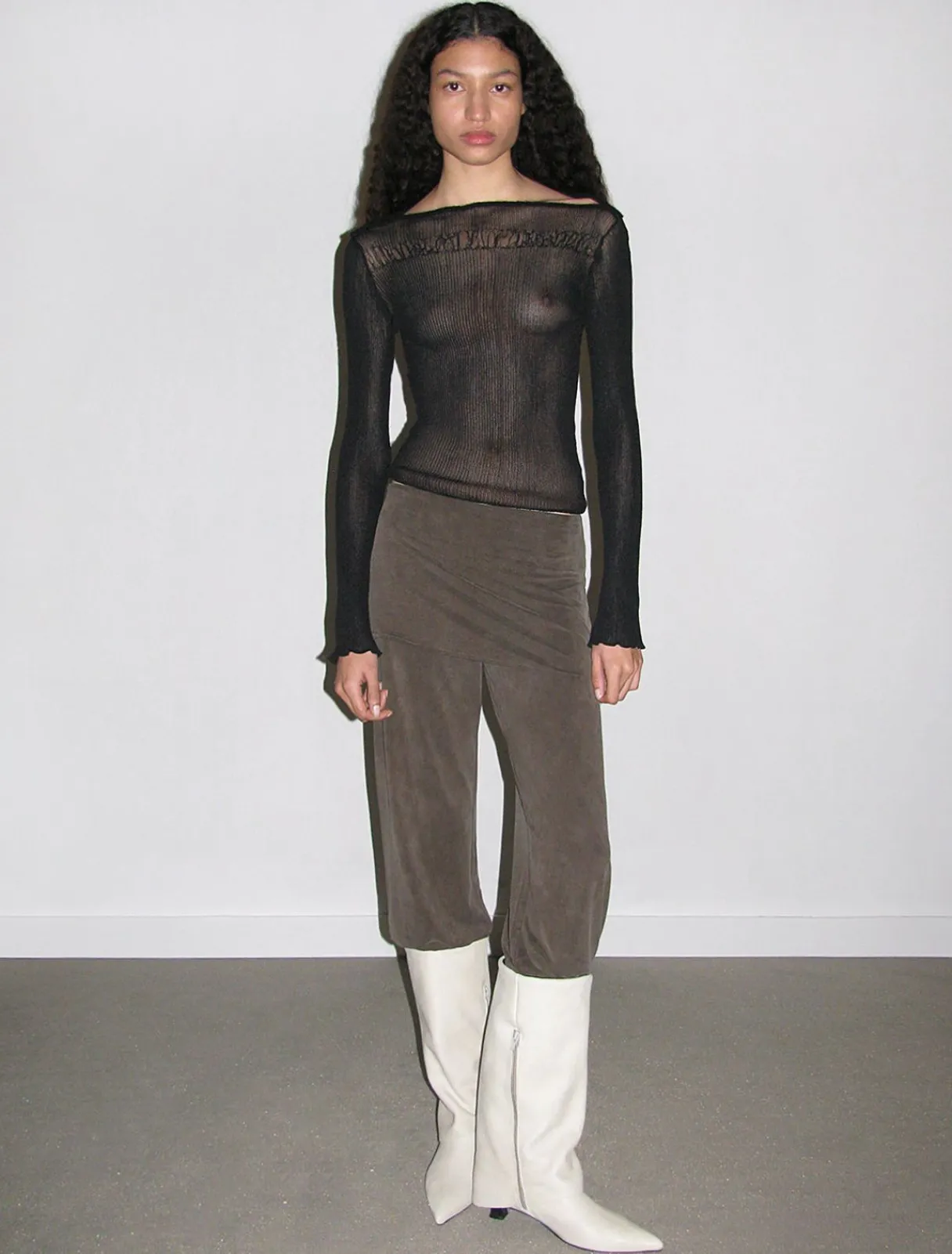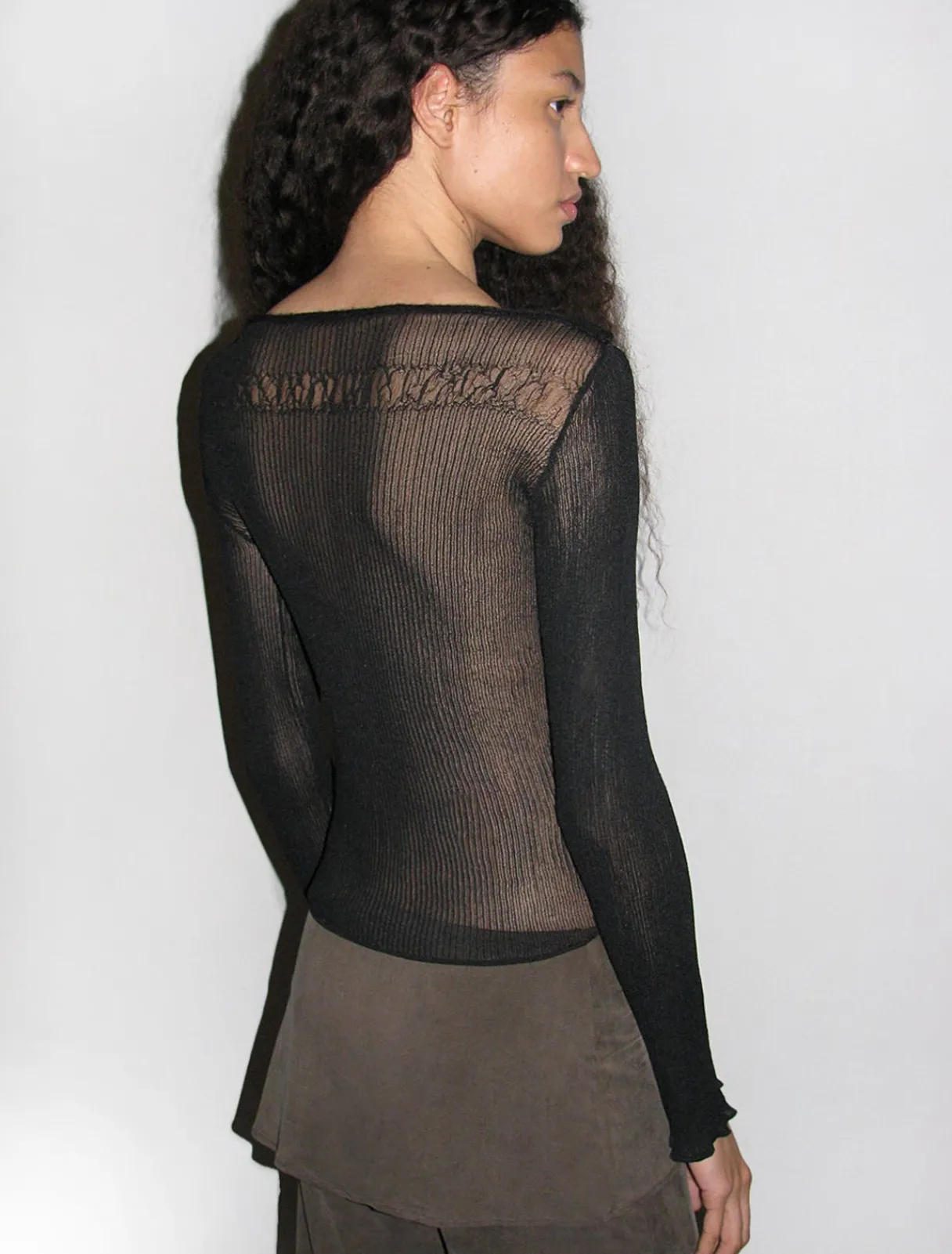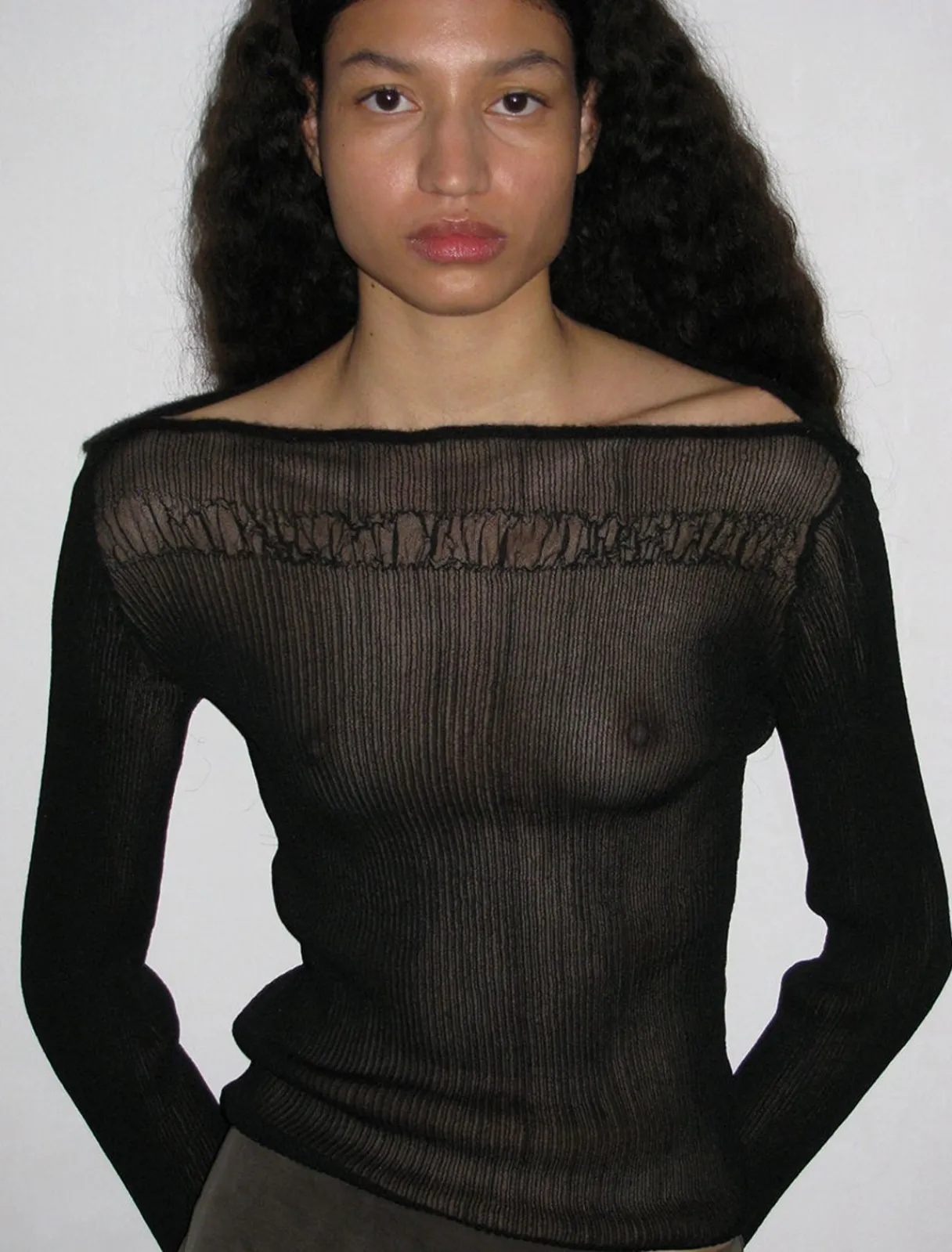 Lang, Delikat, Strikket Langærmet Top Med En Bådudskæring Og Anderledes Strikdetaljer.