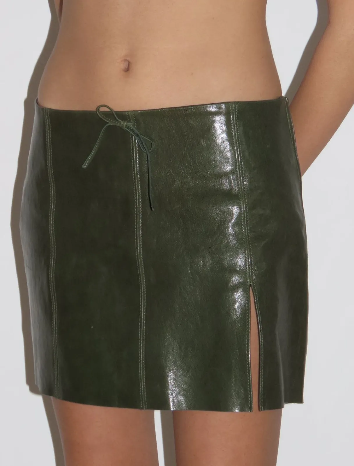 Blankt Lædernederdel Med Åbning Foran Og Sløjfedetalje. Usynlig Sidelynlåslukning Og Acetatfor.