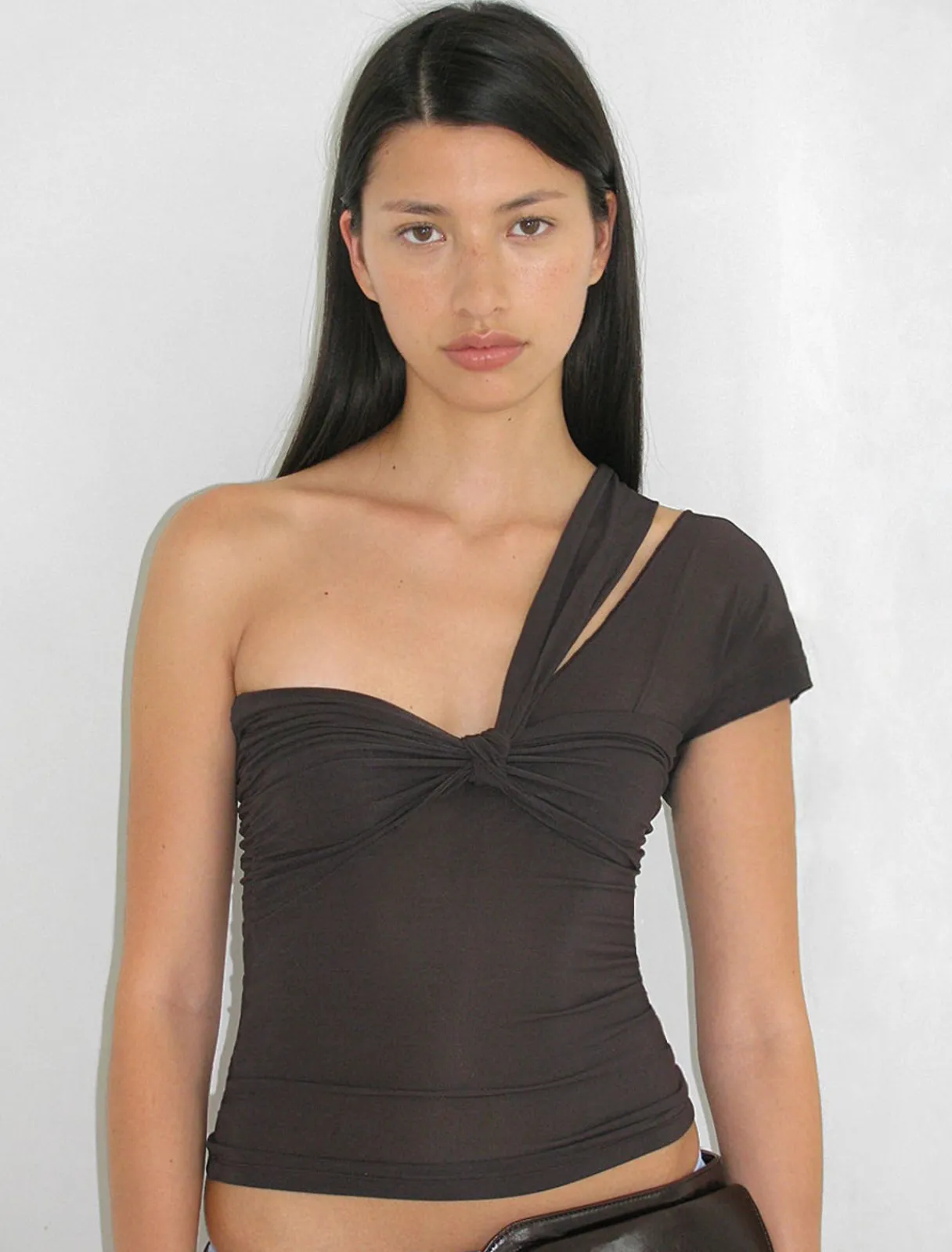 Asymmetrisk Low-Cut Fitted Top Med En Knude Foran Og Overlappende Stykker.