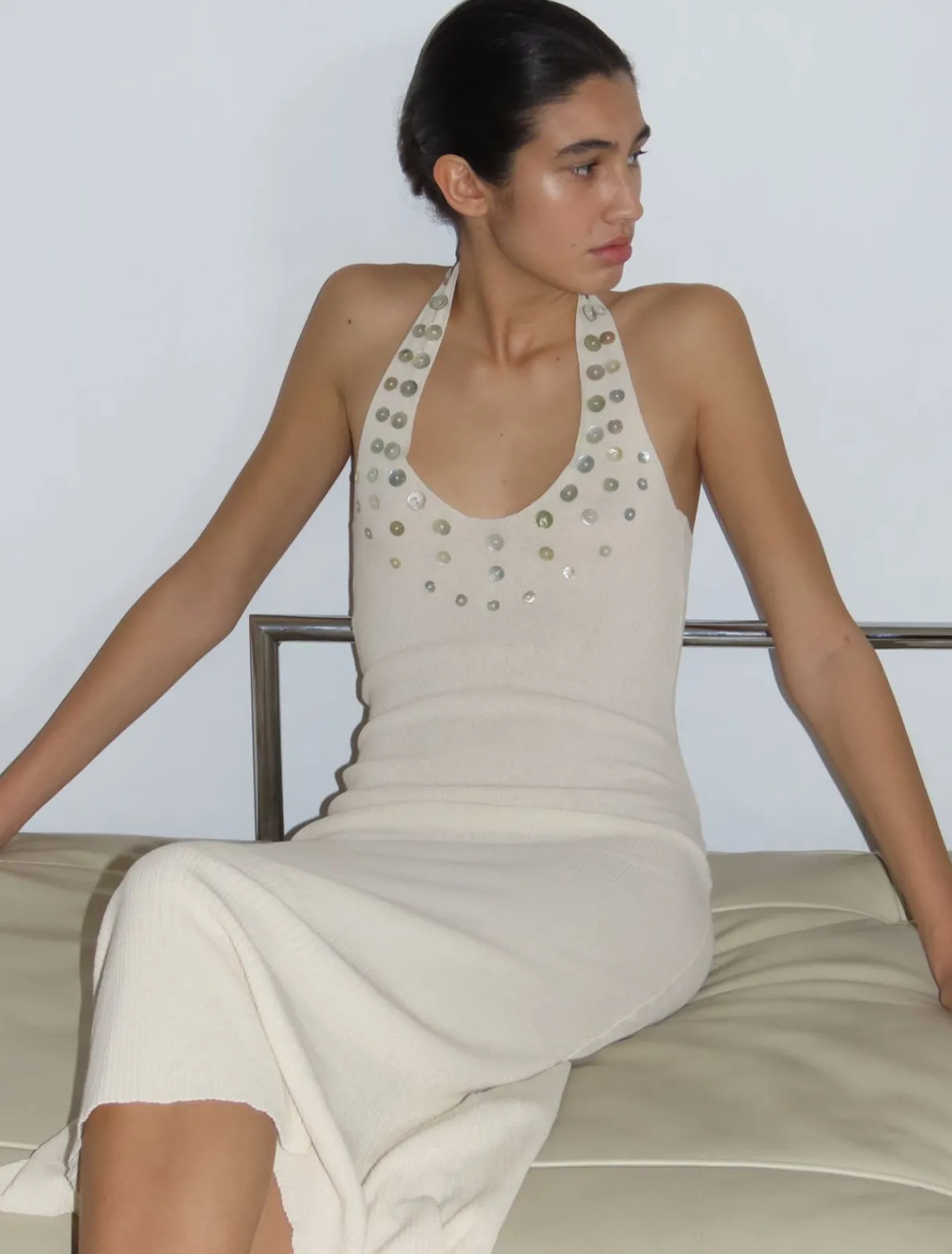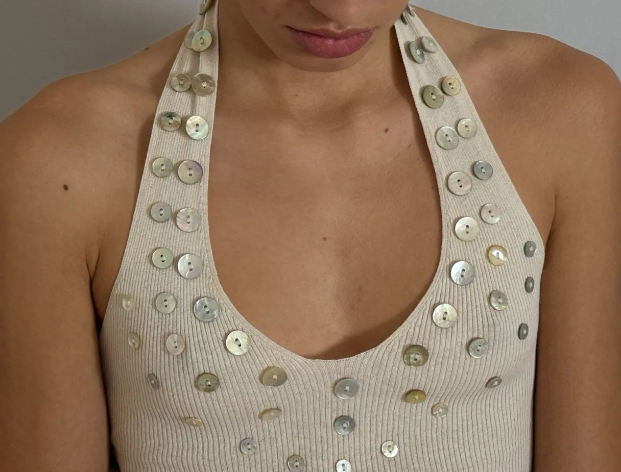 Halsudskæring Prydet Med Håndsyede Perlemor-Knapper.
