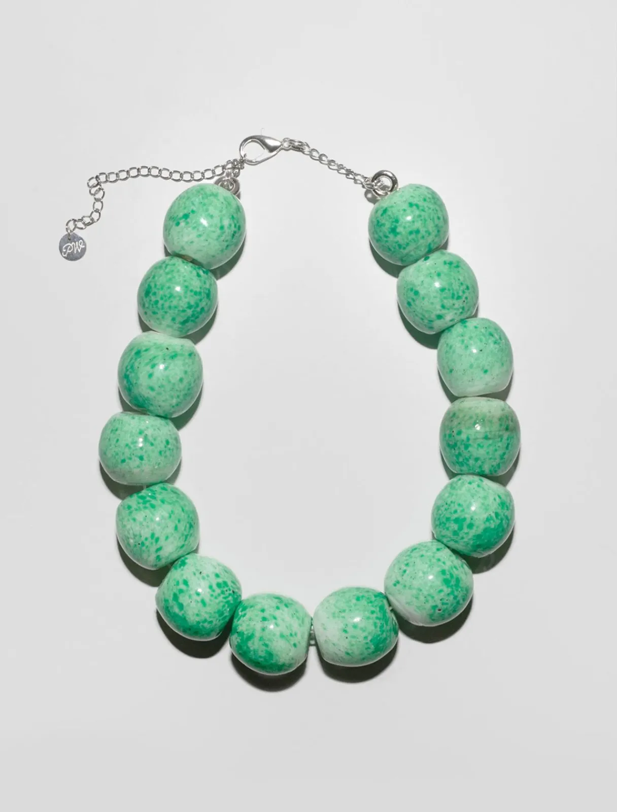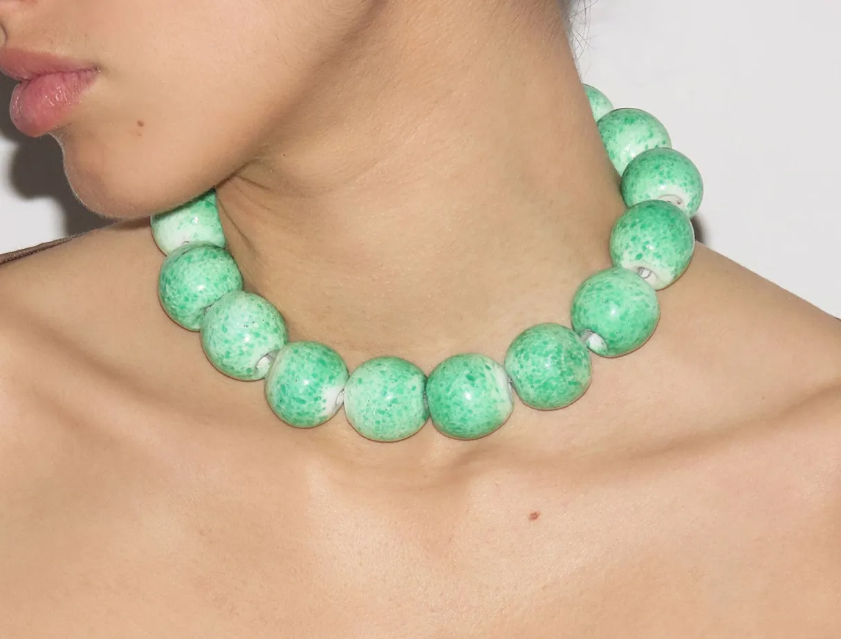 Halskæde Af Store Keramiske Perler. Forgyldt Sølvkæde Og Lås.